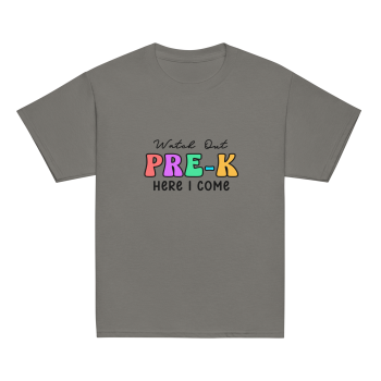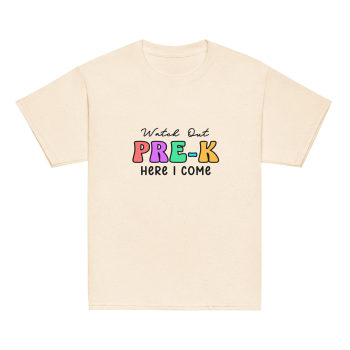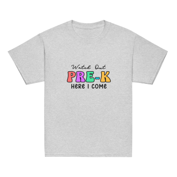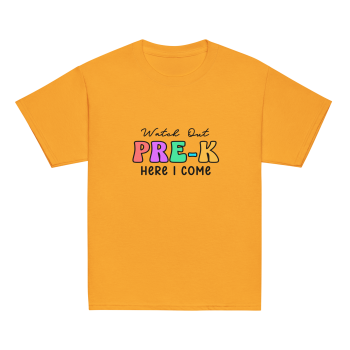 Get ready to make a grand entrance into Pre-K with our fun and vibrant “Watch Out Pre-K, Here I Come” tee shirt!